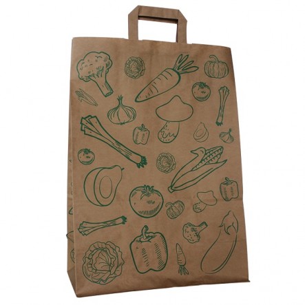 Deze papieren tassen zijn gemaakt van 90 grs. bruin FSC® Mix Credit kraft. Het materiaal is watervast en onbewerkt waardoor deze tassen een stoere en ecologische uitstraling hebben.De tassen zijn all-over bedrukt met een groente dessin.